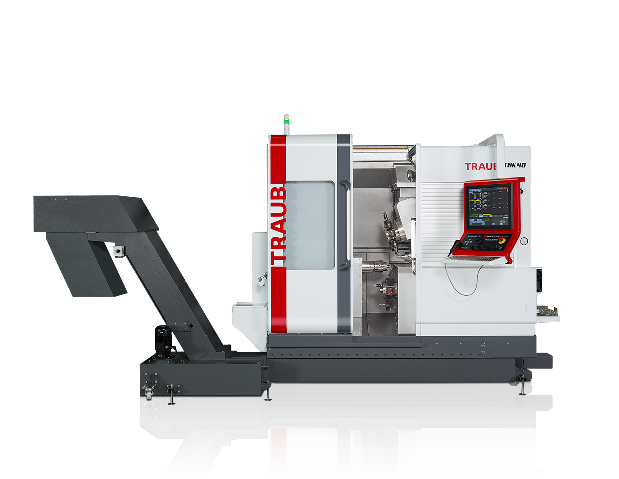 Die TRAUB TNK40 verfügt über zwei baugleiche Arbeitsspindeln und zwei Werkzeugrevolver, jeweils mit X, Z und Y-Achse. Darüber hinaus kann sie zusätzlich mit einer Front und Rückseiteneinheit ausgestattet werden. Der obere Werkzeugrevolver kann optional mit B-Achse ausgeführt werden.