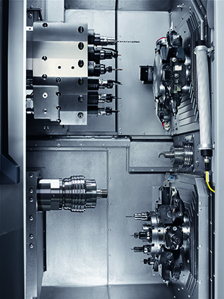 Das Arbeitsraumkonzept ermöglicht eine simultane und produktive Bearbeitung mit zwei Werkzeugrevolvern und einer Front- und Rückseiteneinheit.