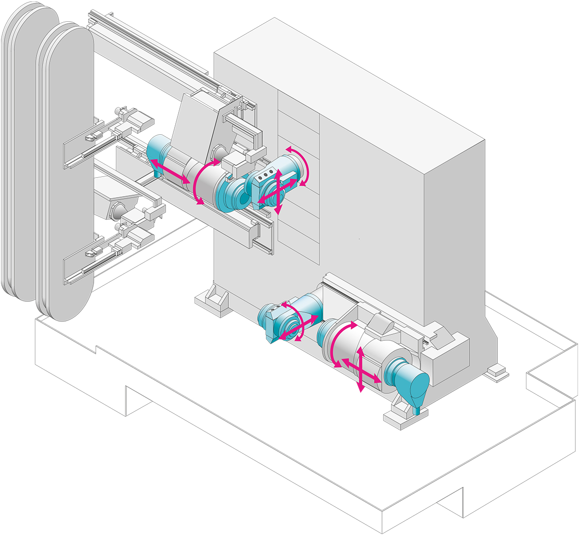 Die Anordnung der Frässpindeln in der Mitte des Maschinenbetts sorgt für eine Krafteinleitung über besonders kurze Hebelarme Das Resultat ist eine hohe Schwingungsdämpfung und damit verlängerte Werkzeugstandzeiten.