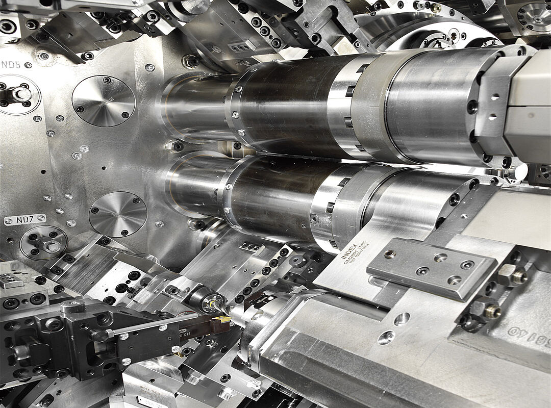 INDEX CNC-Mehrspindeldrehautomat mit angetriebenen Werkzeugen eröffnen Ihnen völlig neue Möglichkeiten, wie beispielsweise außermittiges Bohren und Gewindeschneiden, Schrägbohren, Querbohren, Konturfräsen, Abwälzfräsen (Verzahnen) und das Mehrkantdrehen.