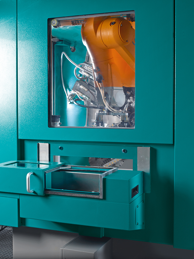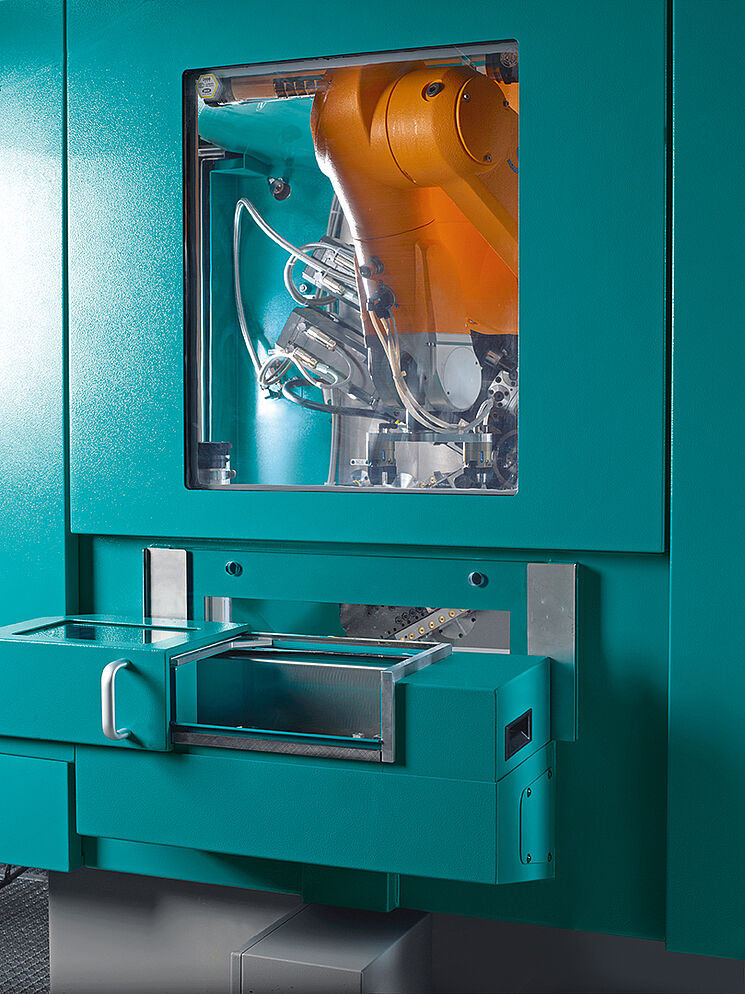 - Flexible, lageorientierte Be- und Entladung in allen 6 Spindellagen durch im Arbeitsraum integrierten Roboter mit Doppelgreifer