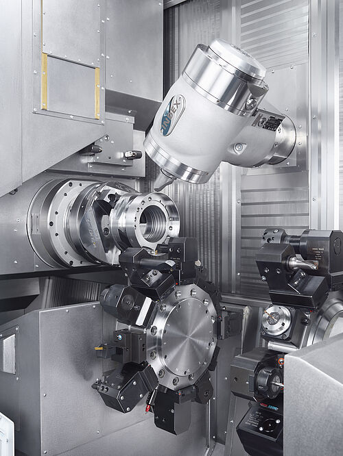 Wie weitreichend das Automatisierungs-Know-how bei INDEX vorhanden ist, lässt sich vor allem am neuen großen iXcenter sehen, der am Dreh-Fräszentrum INDEX G420 vorgestellt wird. Er besteht aus einer vor der Maschine platzierten Roboterkabine, an die von zwei Seiten unterschiedliche Module angedockt werden können: Paletten-/Regalmodule, Mess-/Prüfstationen sowie Einrichtungen zum Entgraten, Reinigen oder Laserbeschriften und vieles mehr.