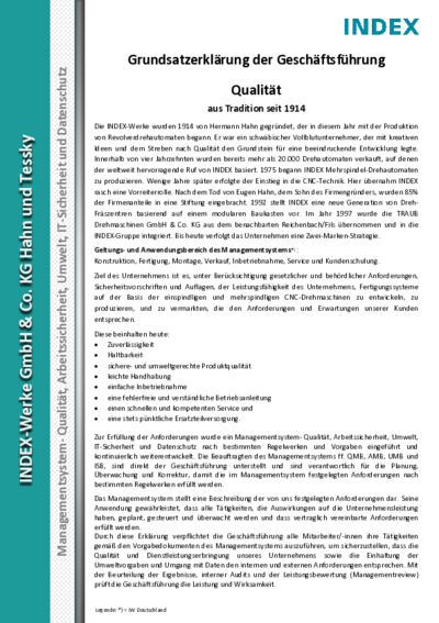Qualität ist das, was der Kunde will! Auch für die INDEX Werke ist das oberste Ziel, die Kunden glücklich zu machen und deren Erwartungen zu erfüllen und zu übertreffen. Um diese Anforderungen zu erreichen, versuchen wir nach bestem Vermögen dafür zu sorgen, dass alle Mitarbeiter ein fest verankertes Qualitätsbewusstsein haben und ihren Teil zum Qualitätsmanagement beitragen.