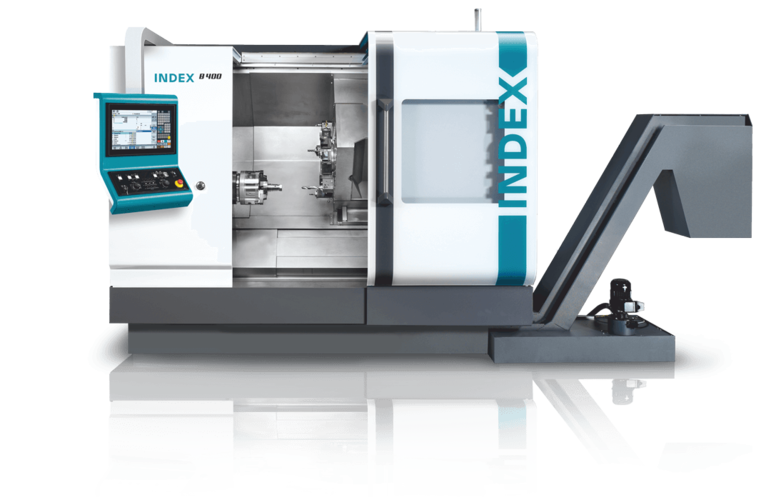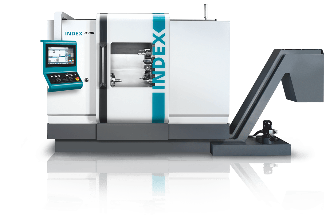 The INDEX B400 represents a logical further development of proven manufacturing solutions within the INDEX Group. Individually equipped, this new flexible universal lathe takes its place both in tooling and prototyping, but also in production Decades of accumulated know-how is reflected in numerous design details, such as in a pocket in the panel above the mainspindle which ensures collision-free use of long boring bars.