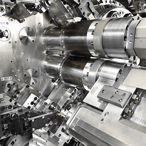 The workpiece handling system for chuck parts and bar segments can be used for 8-spindle machining with and without synchronous spindle, as well as for double 4-spindle machining.