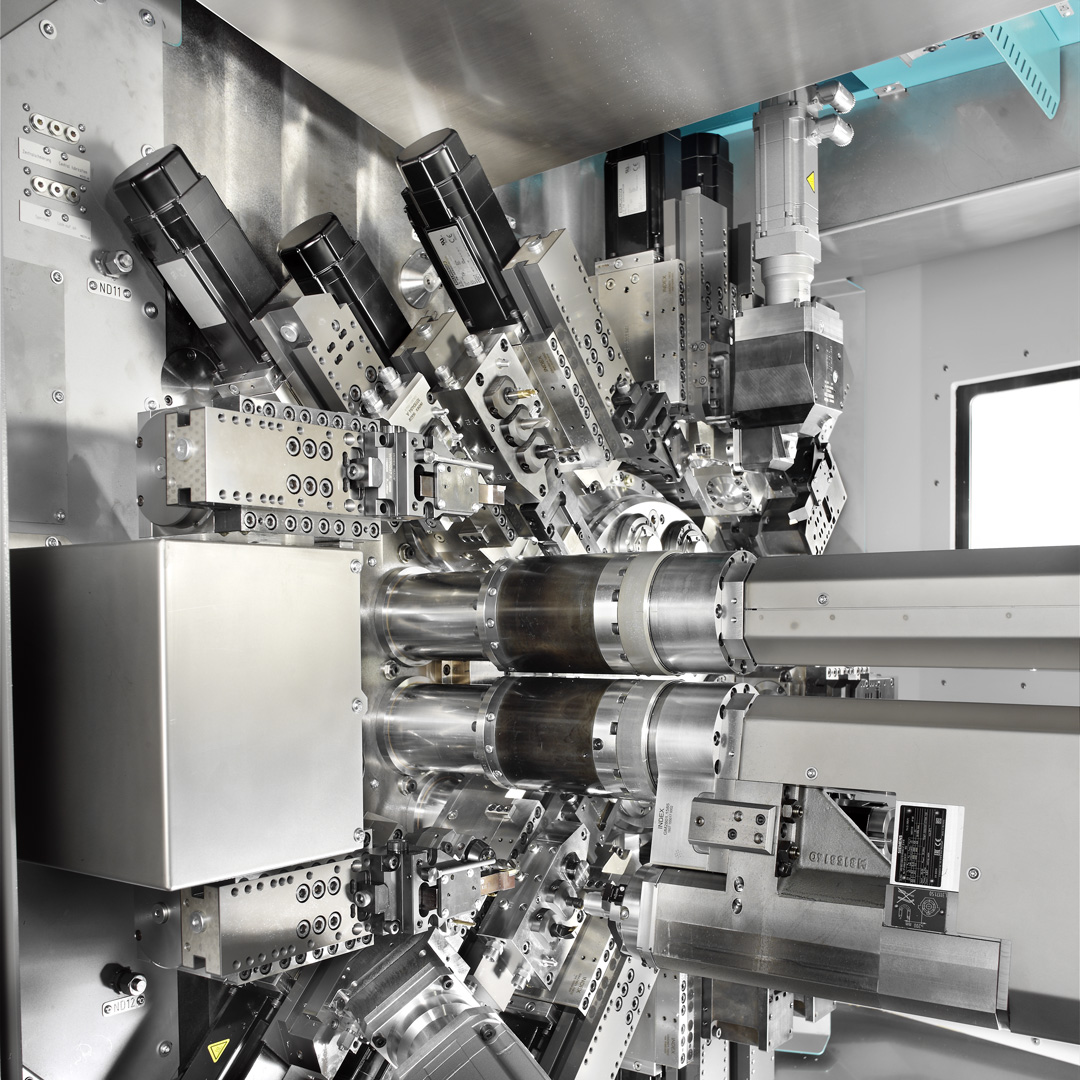 - Availability per workpiece: 6 x X/Z-slides, 1 x synchronous spindle, 1 x part-off tool with back drilling tools, 1 x back-drilling slide X-NC, 1 x back-drilling slide X/Z-NC
