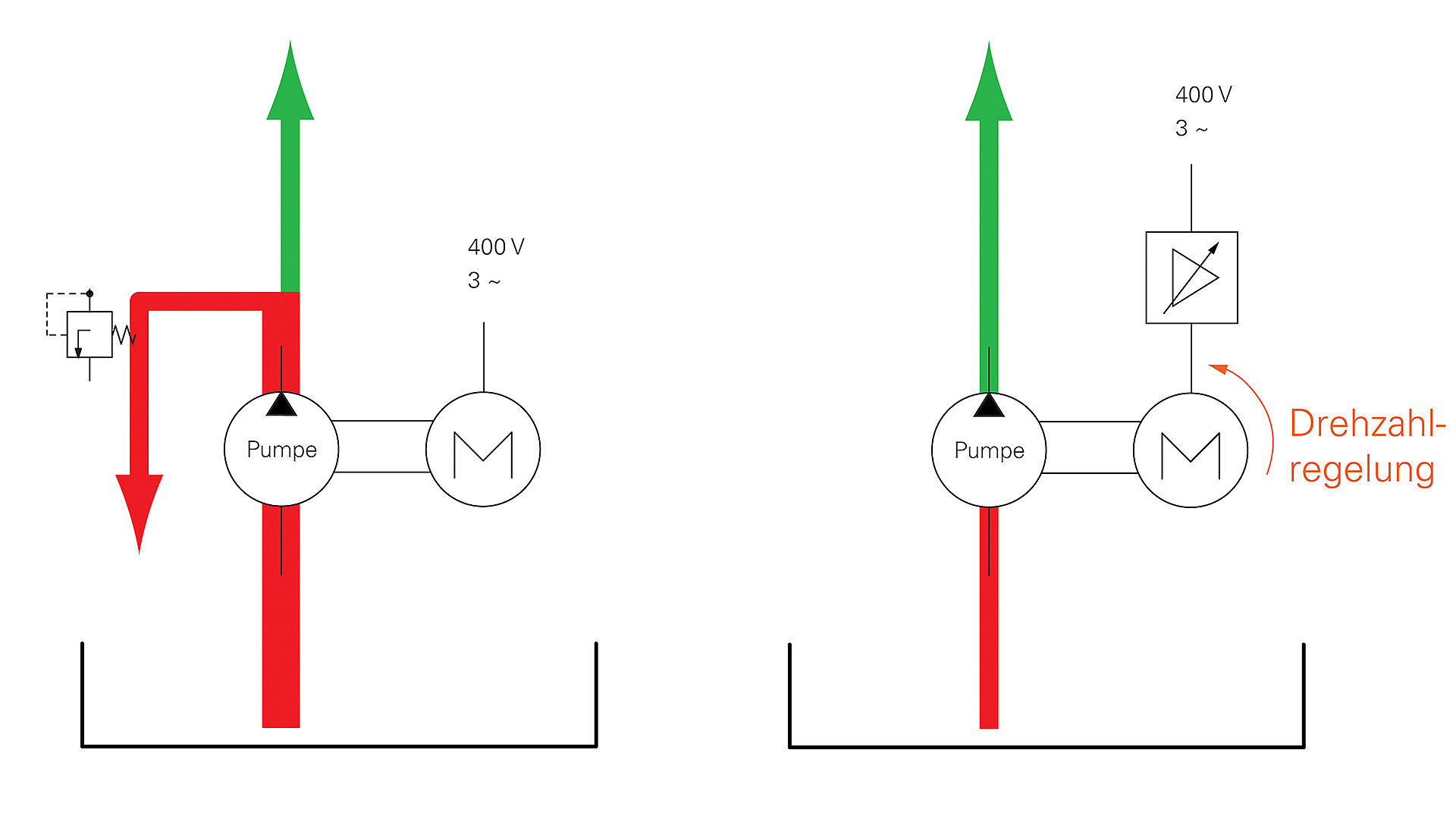 Pressure-driven control of low and high pressure cooling lubricant amounts results in energy optimized cooling lubricant supply. The pump speed is continuously and automatically adjusted to deliver only the amount of cooling lubricant that is actually needed. This results in significant reduction of electric energy consumed and hence in significant cost savings – especially in multi-shift operations. The energy and cost benefits are noticeable even with consumer valves fully closed, because the demand-driven controller limits the cooling lubricant amount transported to almost zero.