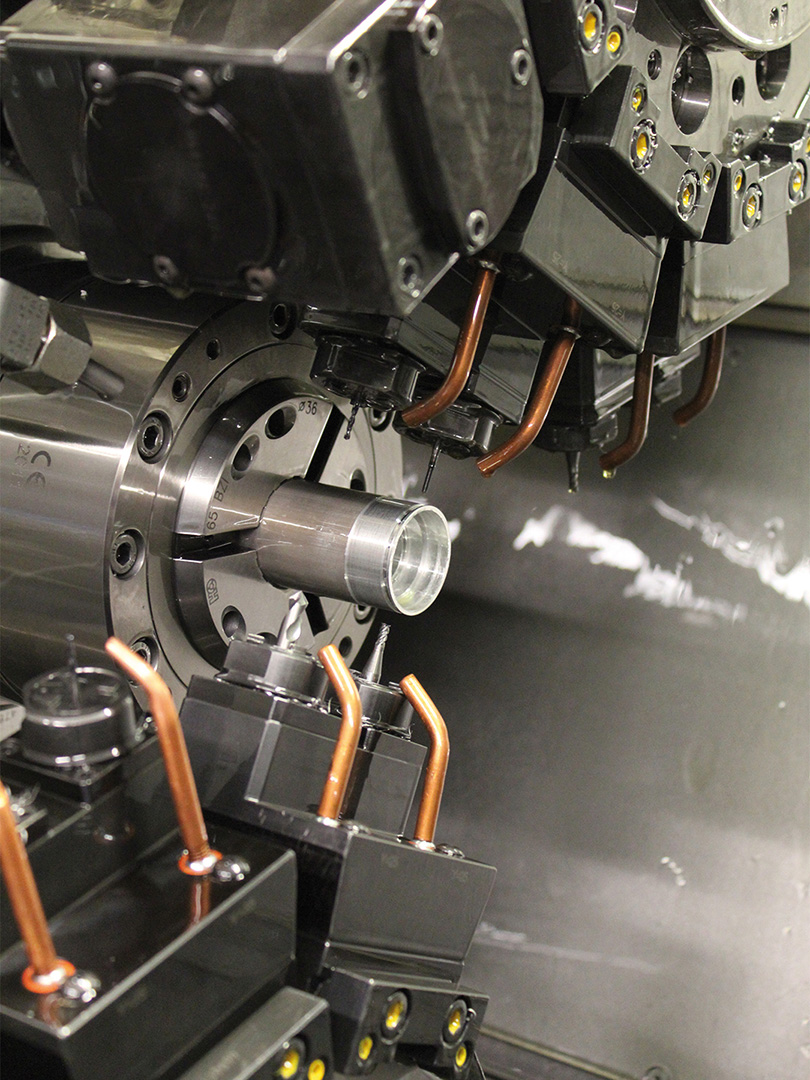 Los tres portaherramientas se pueden utilizar simultáneamente y de forma independiente en los dos husillos idénticos del TNX65/42. El resultado es un mecanizado de alta precisión y con estrictas tolerancias de forma y posición. El mecanizado con aceite como lubricante de refrigeración aumenta la calidad, un hecho muy apreciado por Roland Burghart, a la vista del acabado superficial y los tiempos de inactividad de herramientas conseguidos. Además, los tornos SICK Stegmann están equipados con un sistema de control de la temperatura del lubricante de refrigeración.