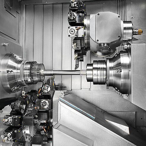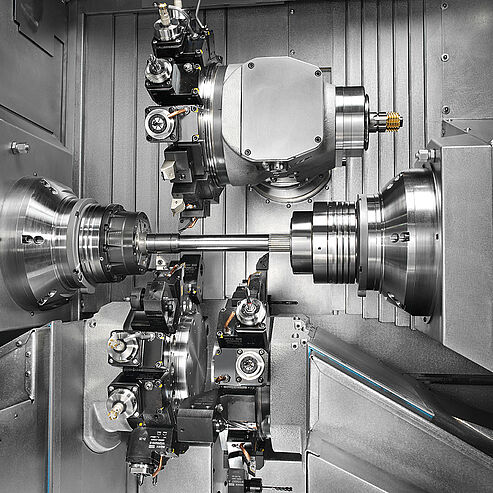 Se pueden usar en el husillo principal y el contrahusillo del centro de torno y fresa hasta tres portaherramientas con eje Y y un total de 42 estaciones de herramientas (VDI25). También son posibles en la configuración del G200 un contrapunto o una luneta del revólver con un rango de sujeción de 10 - 66 mm.