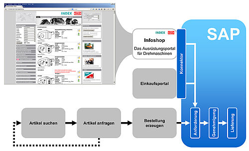 Comme beaucoup de clients utilisent leur propre système de gestion de marchandises au sein duquel ils doivent exécuter leurs commandes, les offres Infoshop doivent être enregistrées une nouvelle fois dans ce système. Ceci génère une rupture entre les supports et un traitement inefficace. De plus, le risque d'erreurs de saisie augmente. Une solution d'interface spéciale permet à présent de connecter l'Infoshop directement au système informatique du client. Alexander Hoffmann, responsable produits chez INDEX-TRAUB, explique le déroulement simplifié des commandes : » Le client se connecte à son système informatique. Il n'a pas besoin de mémoriser des mots de passe de magasins divers, puisqu'un lien transmet directement les données de connexion à l'Infoshop. Le client peut alors directement sélectionner les articles et les placer dans son panier. Ensuite, il transmet son contenu automatiquement à son propre système de gestion de marchandises. Du traitement des commandes aux contrôles de réception de marchandises et au traitement des factures, les processus habituels s'exécutent dans son propre système de gestion de marchandises. Il suffit que le système d'achat fonctionne sur réseau et que les fichiers de sortie puissent être traitées au format OCI. «