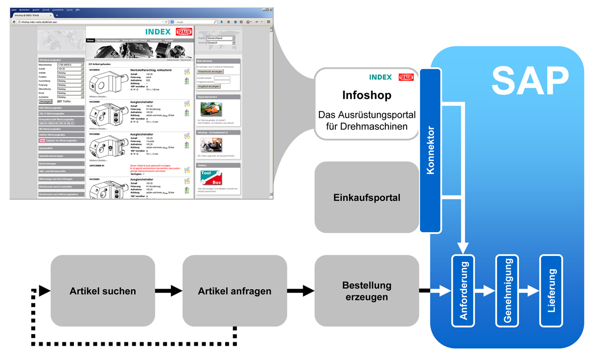 Le responsable produits Hoffmann explique les retours d'expérience positifs obtenus lors du projet pilote chez un client important. » L'interface SAP fonctionne à la perfection. Nous souhaitons à présent étendre le système pour aider d'autres clients à optimiser leurs processus de commande. L'ensemble du processus composé de la recherche d'informations, de la demande de prix, de la commande, de la livraison et du traitement des factures est simplifié et accéléré grâce à la nouvelle interface Infoshop. Nous sommes déjà très proches de notre objectif « One-stop-shopping ». Parce qu'un client doit pouvoir commander dans l'Infoshop tous les articles dont il a besoin pour l'exploitation de ses machines INDEX-TRAUB, et ce à un prix intéressant, sans lacunes et en une excellente qualité. «