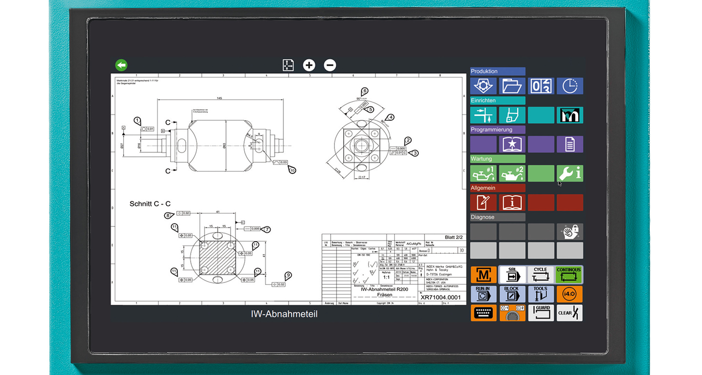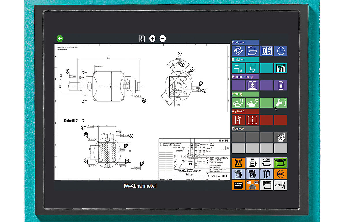Sur le côté droit de l'écran tactile se trouve une barre de commande verticale comprenant le clavier alphabétique, le pavé numérique, les touches de curseur et quelques touches de fonctions supplémentaires. L'une d'elle est la touche « i4.0 ». Si elle est effleurée la barre de commande commute vers un affichage focalisé sur l'activité. De nombreuses nouvelles fonctions sont affectées aux zones de production, réglage, programmation, maintenance, généralités et diagnostic. iXpanel permet à l'opérateur de commuter à tout moment entre le masque de commande « normal » et ce « second masque » avec les fonctions spécifiques à l'activité. De plus, l'affichage plein écran de formats PDF et des fonctions de navigation / zoom intuitives à l'écran tactile facilitent le transfert sécurisé des informations.
